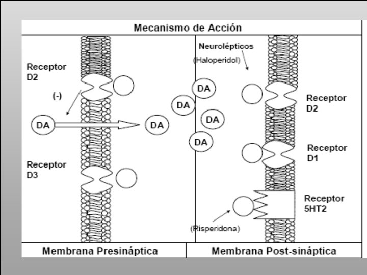 MECANISMO DE ACCION � Administrados: � Ocupan los receptores de la dopamina y serotonina � Antogonistas quimicos) � La oral, sublingual, intra muscular o IV. y producen tranquilidad (lobotomizadores + parte bloquea a los receptores post-sinapticos de D 2 del sistema nerviosos central en el sistema mesolimbico.