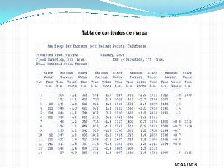 Podemos hablar de cinco grandes grupos de Corrientes: ØOceánicas: Son aperiódicas, como en el caso del Gulf Stream, o con periodos muy largos, como el caso de las monzónicas. Transportan considerables masas de agua a distancias de millares de kilómetros afectando a la capa de agua superficial (primeros centenares de metros). ØDe marea: Periódicas, diurnas o semidiurnas, y están afectadas por la atracción lunar. ØCorrientes que acompañan al oleaje y la marejada: Son las responsables de las grandes modificaciones del litoral en el curso de las tempestades, bajo el efecto de corrientes que pueden alcanzar velocidades de 0, 50 m/seg. ØCorrientes de turbidez: Coexisten casi siempre con otras corrientes, teniendo una gran influencia en su génesis y extensión, como por ejemplo en las grandes corrientes oceánicas. ØCorrientes de densidad: Se deben a la presencia vertical de dos masas de agua con densidades diferentes, de modo que la superior tenga mayor densidad que la inferior y la superficie isobárica sea oblicua, actuando sobre ambas masas la fuerza de coriolis que facilita el desplazamiento de una sobre otra.