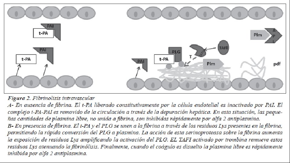 Fisiología de la lisis del cuagulo La fibrinólisis del coágulo es un proceso controlado y localizado sobre la Red de fibrina evitando así la proteólisis , cuando la fibrina se forma , el coágulo mismo o la trambina que le dio origen a estimular a la célula endotelial a secretar t-PA.