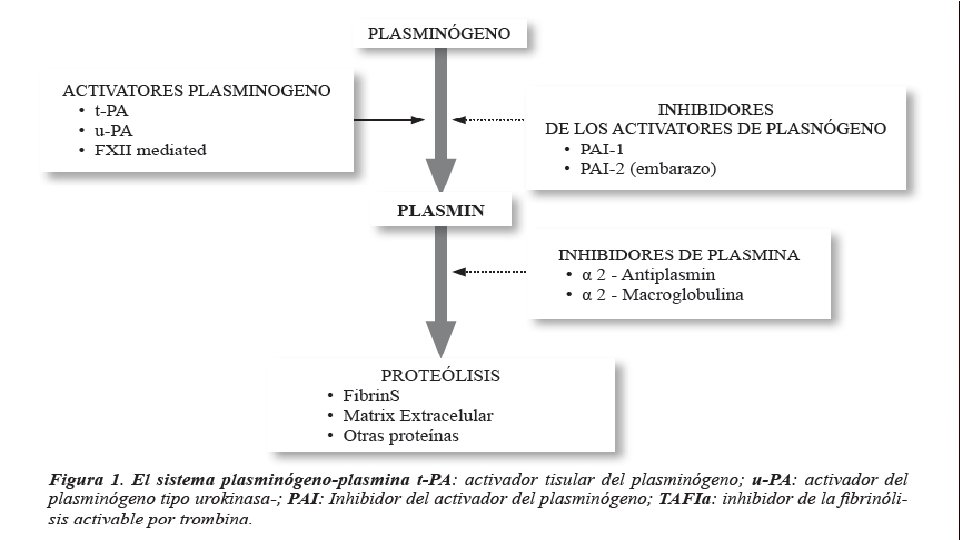 La inhibición del sistema plasminógeno/plasmina 1. Inhibidor del activador del plasminógeno-1 (PAI-1) es el principal inhibidor de t-PA y u-PA. PAI-1 a través de la inhibición de t-PA es un regulador negativo de la fibrinólisis. La más importante está dada por la Antiplasmina sintetizada en los hepatocitos, está unida a la fibrina que inhibe a la plasmina. 2. Inhibidor del activador del plasminógeno-2 (PAI-2) Este inhibidor se está presente en la placenta humana e inhibe al t-PA y a u-PA. 3. Inhibidor de la fibrinólisis activable por trombina (TAFI) La proenzima TAFI es sintetizada en el hígado y está presente en la plaquetas. El t-PA está involucrado en la activación de la vía de degradación de fibrina, mientras que el u-PA activa la vía que participa en la remodelación tisular.