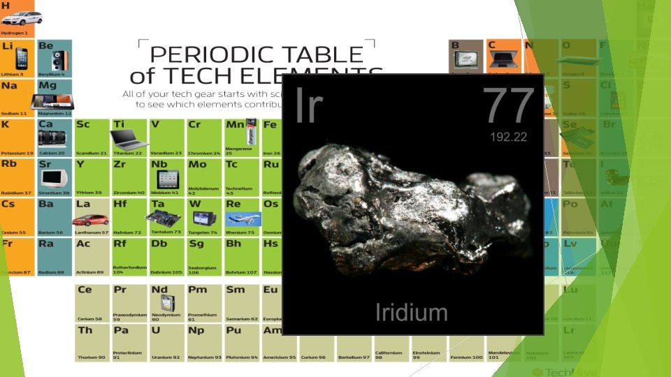 Historia Su nombre es Iridio. Este es un metal de transición (los que se encuentran al centroabajo en la tabla periódica) de color blanco plateado y uno de los elementos mas densos y resistentes a la corrosión que se conocen. Sus sales son bastantes coloridas razón por lo cual en la Antigüedad se le acuñó en honor a la diosa Iris su nombre actual, por lo que deriva de “arco iris”. Se encuentra en mayor parte en meteoritos que caen a al tierra.