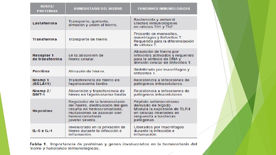 PROTEÍNAS Ferritina. I. Almacenamiento de hierro. – Se encuentra en tejidos animales: abundante en el hígado. Hemoglobina (mayor porcentaje de hierro). I. Transporte de oxigeno por medio de glóbulos rojos. a) Eritrocitos: transporta oxigeno del pulmón al resto del organismo en la hemoglobina.