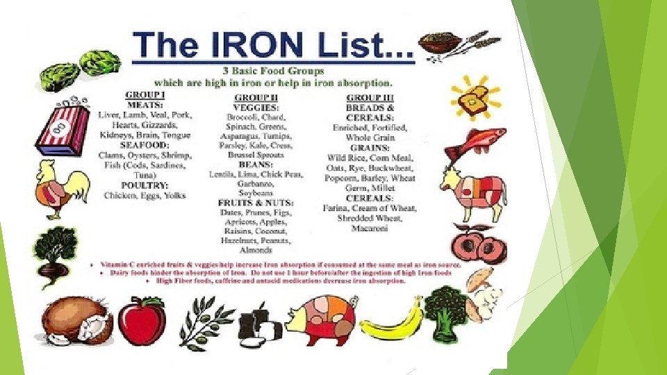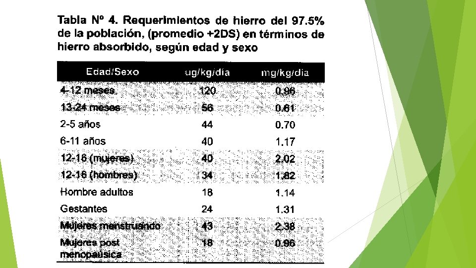 Datos de consumo: Absorción del hierro incrementa cuando bajan los niveles en el organismo y viceversa (intestino). La necesidad de consumo es baja y solo 10 % es absorbida por el organismo. Dentro del hierro dietario hay dos tipos: • Heme: Se encuentra en carne, pescado, pollo. • No heme: 90% de la dieta encontrada en cereales, leguminosas, vegetales y huevos.
