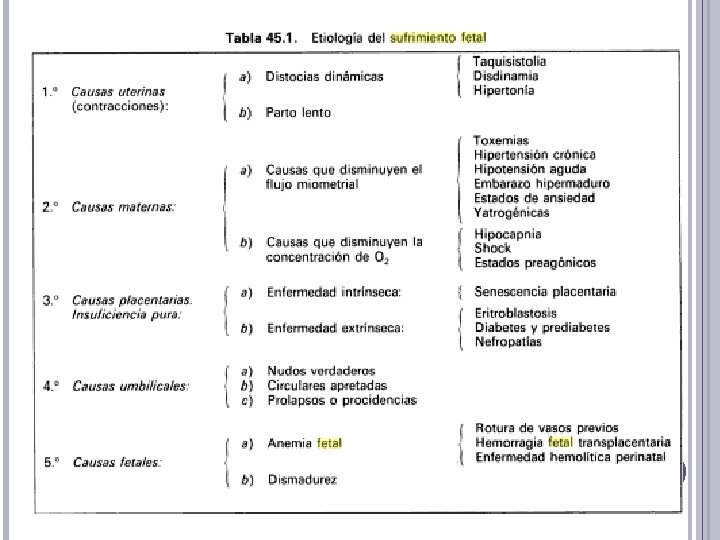 Causas placentarias SUFRIMIENTO FETAL CRÓNICO Anormalidad de la placenta Envejecimiento placentario prematuro, diabetes sacarina Gestaciones múltiples Sobre distención del útero y peligro de parto prematuro y riesgo de transfusión gemelo - gemelo Otras Pos madurez , anomalías congénitas , infecciones congénitas y eritroblastosis fetal Causas fetales