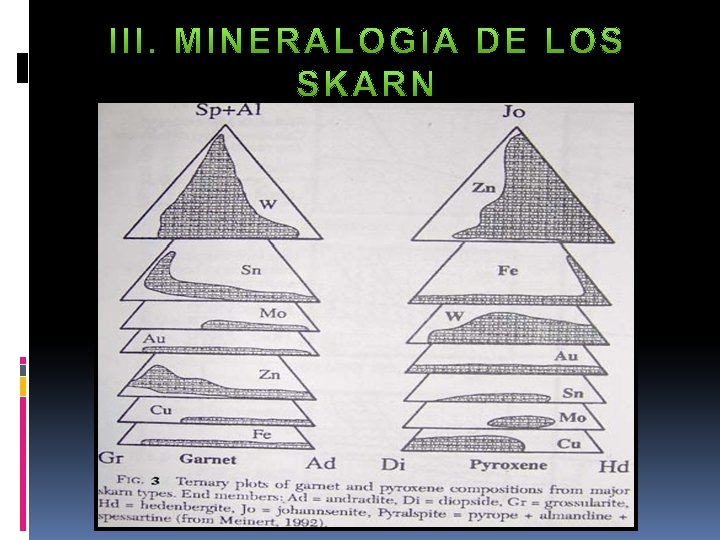SKARN DE W Estos yacimientos ocurren en ambientes de margen continental, relacionados a magmas de subducción calcoalcalinos del tipo "I" de composición granodiorítica y cuarzomonzonítica, emplazados en secuencias de rocas calcáreas – lutíticas. Los minerales calcosilicatados típicos son granates, piroxenos, scheelita y wollastonita. Estos minerales son los de mayor temperatura dentro de los minerales de skarn. La alteración tipo skarn ocurre en el contacto inmediato entre el intrusivo y la roca huésped calcárea, tanto a nivel de exoskarn como endoskarn. En general estos yacimientos están asociados a intrusivos relativamente profundos, bien cristalizados y textura fanerítica granular. Pueden gradar a skarn de Cu, o presentarse en contacto inmediato, con muy pequeño desarrollo en skarns de Cu.