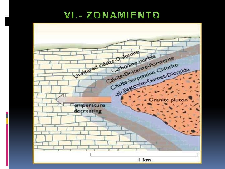 Zonación que sucede en la mayoría de los skarn la cual copia la geometría del contacto del plutón y los flujos de fluidos. Los Skarn son zonados y la zona de endoskarn y exoscarn proximal posee un alto contenido de Granate. Las zonas distales son más ricas en piroxeno