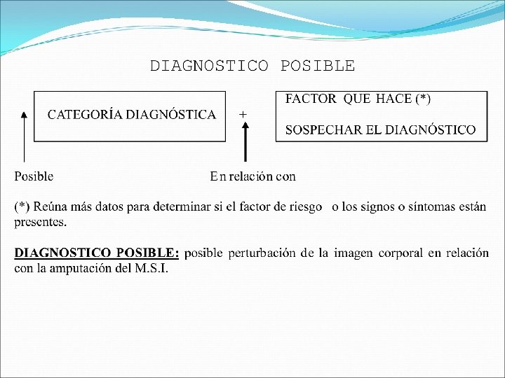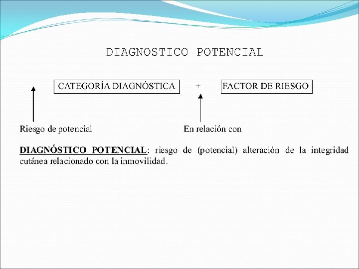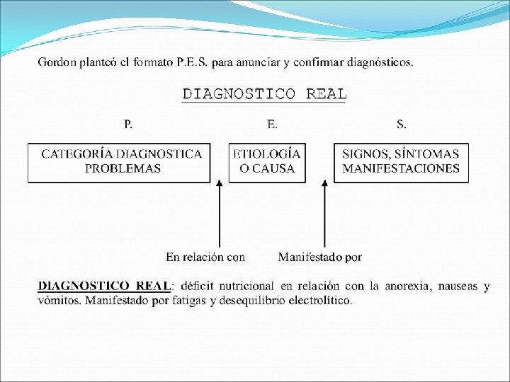 Se define como Diagnóstico de enfermería a la relación causal entre un problema y sus factores relacionados o de riesgo. Comprende sólo aquellos estados de salud para los que los profesionales de enfermería están formados y autorizados para tratar. Ej. para el diagnostico médico Diabetes Mellitus El diagnóstico de enfermería seria: la deficiencia de conocimiento, el afrontamiento ineficaz o la nutrición desequilibrada. (Respuestas humanas al diagnostico médico) Tipos de diagnóstico: 1 - Diagnostico actual 2 - Diagnostico de enfermería del riesgo (potencial) 3 -Diagnostico de bienestar (fomento el bienestar espiritual o fomento del afrontamiento familiar) 4 - Diagnósticos de enfermería posibles ( Pruebas de existencia de un problema de salud no están claras exige más datos para su apoyo o rechazo. ) 5 - Diagnostico sindrómico (riesgo de síndrome por desuso)