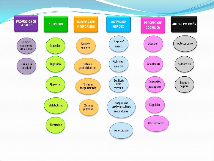TAXONOMIAS Se trata de una forma de clasificación de diferentes elementos de acuerdo a sus características comunes. Actualmente, la taxonomía de la NANDA-I incluye 234 diagnósticos de enfermería que son agrupadas (clasificadas) en más de 13 dominios (categorías) de la práctica de enfermería: Las taxonomías enfermeras clasifican la terminología científica de la profesión. Taxonomía NANDA clasifica los diagnósticos enfermeros en (dominios, clases y diagnósticos) Taxonomía NOC clasifica los resultados de enfermería en (dominios, clases y resultados) Taxonomía NIC Clasifica las intervenciones de enfermería en (campos, clases e intervenciones)