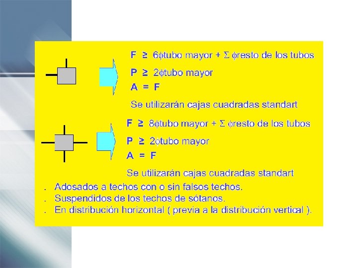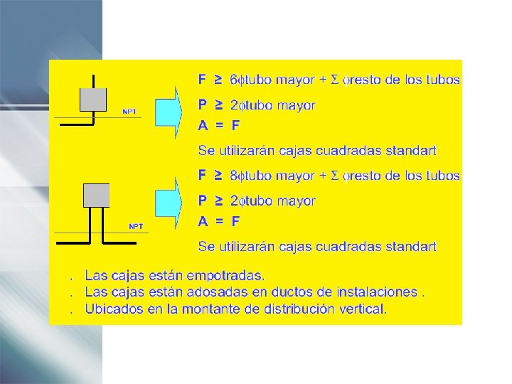 c) Tomacorrientes. - Se ubicaran preferentemente cerca a los extremos de cada pared, en vez del centro para evitar ser cubiertos por los muebles grandes, a menos que se especifique de otra forma, se instalarán a 0. 30 m s. n. p. t. Aunque también lo ubican a 0. 40 m s. n. p. t. En la cocina y baño se ubica entre 0. 90 m a 1. 50 m Dependiendo de la mesa o espejo.