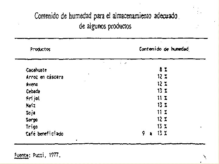 CONTENIDO DE HUMEDAD ADECUADO PARA ALMACENAR PRODUCTOS CONTENIDO DE HUMEDAD % MANI 8 ARROZ CON CASCARA 12 AVENA 12 CEBADA 13 POROTO 11 MAIZ 13 SOJA 11 SORGO 12 TRIGO 13 CAFE 9 A 13