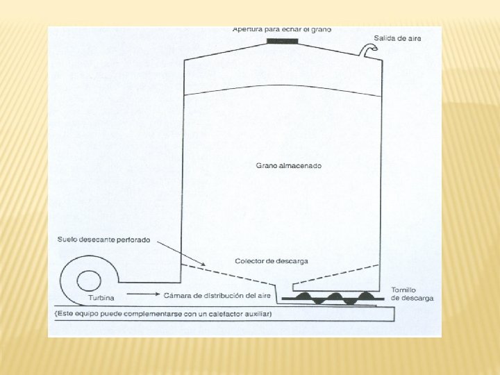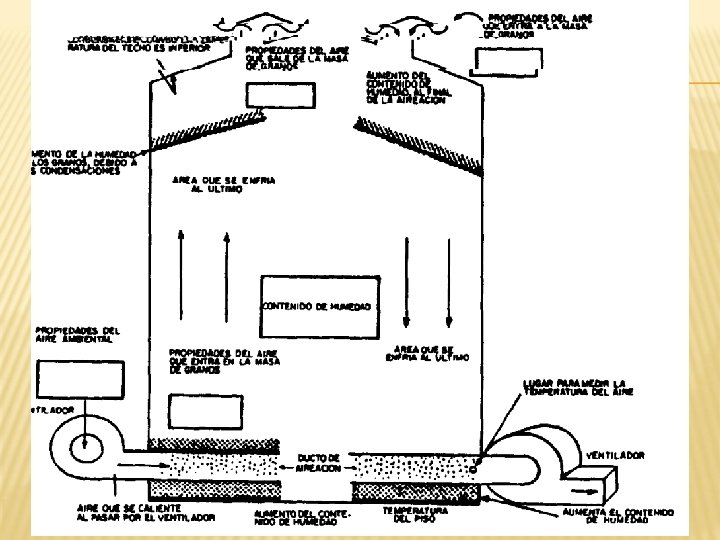 PROCESO DE AIREACIÓN: la aireación consiste en un frente frío que viaja desde abajo hacia arriba del grano dentro del silo. Salida de aire (usar extractores) Aire Grano Ventilador