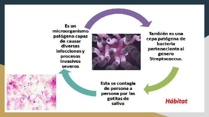 Conocida como estreptococos betahemolítico del grupo A, es ubicuo en la naturaleza. ● Es la causa más común de dolor de garganta de origen bacteriano. ● Habita en la garganta y en la piel de portadores sanos.