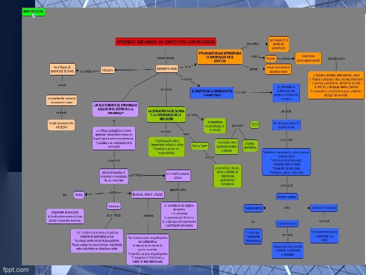 APRENDIZAJE COMUNITARIO • La expresión mas clara y congruente de la experiencia del aprendizaje situado y experimental lo encontramos en el aprendizaje basado en el servicio comunitario.