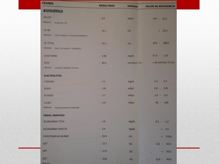 1. - Radiografía tórax PA – L 2. - Perfil hematológico 3. - Bioquímico 4. - gasometría arterial 5. - ECG 6. - Ecocardiograma Solicitud de exámenes