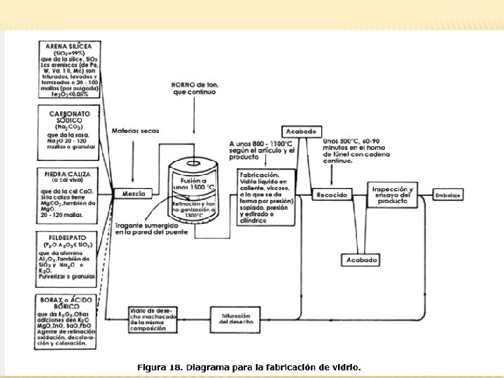 IV. PROCESO DE LA INDUSTRIA DEL VIDRIO � Mezcla de arena, carbonato sodico y material calizo. � La arena (material vitrificante) � El carbonato de calcio (Favorece fusion) � Caliza (Estabilizante y permite un alto grado de resistencia a los agentes atmosfericos)