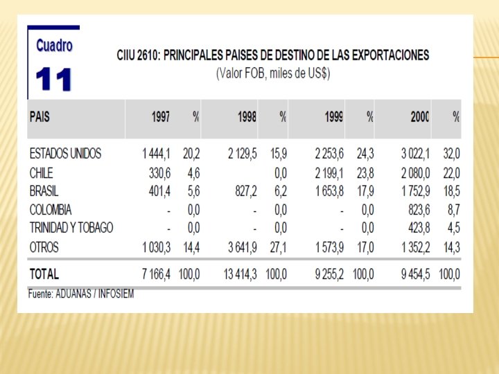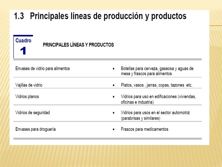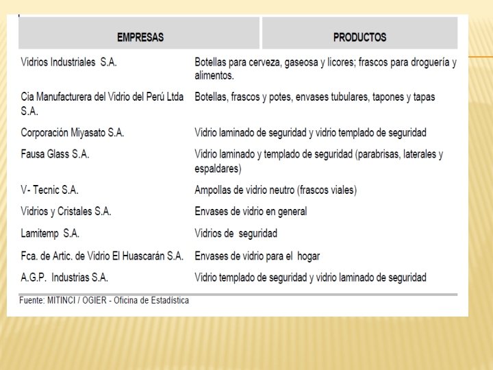 IV. PROCESO INDUSTRIAL DEL VIDRIO � � � OBTENCION DE MATERIA PRIMA + AGUA: ARENA SILISICA CARBONATO SODICO, DOLOMITA, PIEDRA CALIZA, NECELINA SIENITA Y SULFATO SODICO. COMBINACION DE MATERIA PRIMA RECICLADA (VIDRIO CHANCADO) + NUEVA MATERIA PRIMA, FLUJO CONTINUO A UN HORNO DE GAS: TEMPERATURA DE 1500°C 1500 TN DE VIDRIO FUNDIDO, USANDO 500 TN DE VIDRIO FUNDIDO. EN ESTA CAMARA DE COMBUSTION SE PRE-CALIENTA A 1000°C HOMOGENEIZADOR: MEZCLA EL VIDRIO PARA IGUALAR LA TEMPERATURA EN UNAAS HORAS SE REALIZARA EL VERTIDO. RODILLO SUPERIOR: EL VIDRIO SE VIERTE EN UN BAÑODE ESTAÑO LIQUIDO EN EL QUE FLOTA AHORA ES UN MATERIAL BLANDO. TODO SE ENFRIA CON AGUA PARA QUE NOS E ROMPA CON EL CALOR, CUANDO SALE DEL BAÑO EL VIDRIO SALE A 600°C HAY QUE ENFRIARLO UNA VEZ MAS. DE ELLO SE ENCARGARA LA SIGUIENTE MAQUINA. Características: Rodillo de goma del grado superior de la temperatura alta y del envejecimiento resistentes; Transmisión del control de velocidad de la frecuencia y separación reguladora auto de rodillos; Separación ajustable del automóvil del grueso del frente y de rodillos traseros TINTA DE VIDRIO: MIDE 3. 3 M DE ANCHO, LA CINTA DE VIDRIO VA ENTRANDO A LA TINTA DE VIDRIO GRADUALMENTE Y VA ENFRIANDOLA GRADUALMENTE EL VIDRIO AUN ESTA BLANDO. ESCANER LASER: EL VIDRIO DEBE DE TENER UN GROSOR UNIFORME, ESTE ESCANER MIDE CON UNA PRESICION DE CENTECIMA DE MILIMETRO. EL VIDRIO YA ESTA BIEN DURO. RODILLO ULTRADURO DE CARBURO DE BOLFRAMIO: ANTES DEL CORTE HACE UNA MUESCA LONGITUDINAL ANTES DEL CORTE DESPUES HACE LAS MUESCAS TRASNVERSALES SEGÚN LOS DIMENCIONES PEDIDAS POR LOS CLIENTES EL VIDRIO SE SEPARA FACILMENTE. CINTAS TRANSPORTADORAS: TIRAS DE VIDRIO SIGUEN SU CAMINO. RODILLOS: CORTAN LOS BORDEN DE LAS CINTAS DE VIDRIO, EL VIDRIO SOBRANTE CAE EN UN RECIPIENTO POSTERIORMENTE SE RECICLARA. ESTOS RODILLOS FORRAFO DE GOMA GUIAN LAS LAMINAS DE VIDRIO AL DEPARTAMENTO DE INSPECCION: SE MANIPULAN CUIDADOSAMENTE Y SE COLOCAN EN FORMA VERTICAL SE INSPECCIONAN CON LAMPARAS FLUORESCENTES. ALMACEN: SE ALMACENAN EN FORMA VERTICAL.