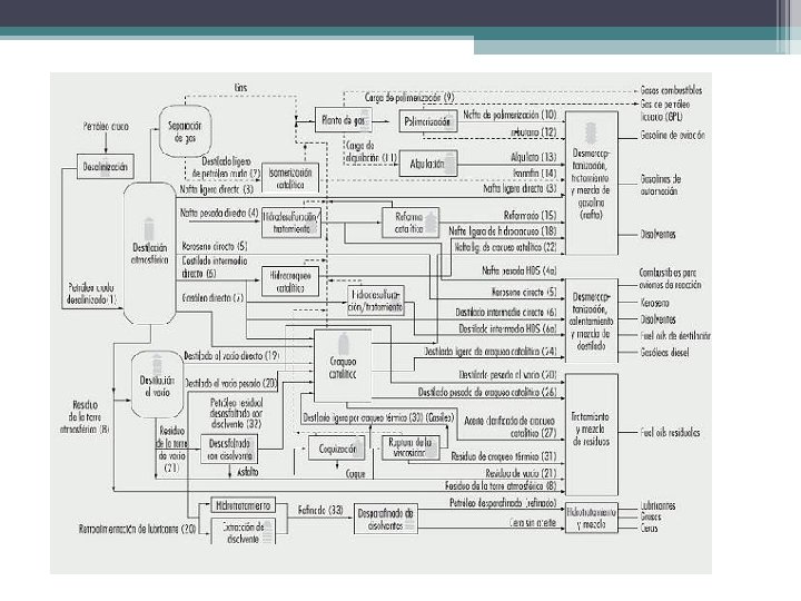 Esquema de refinación primaria y media • Gas de petróleo Ligera • Nafta Pesada Reformador Catalítico Hidrocraqueo • Keroseno • Gas Oil Ligero • Gas Oil Pesado • Gas Oil Liviano de vacío. Isomerización Craqueo Catalítico