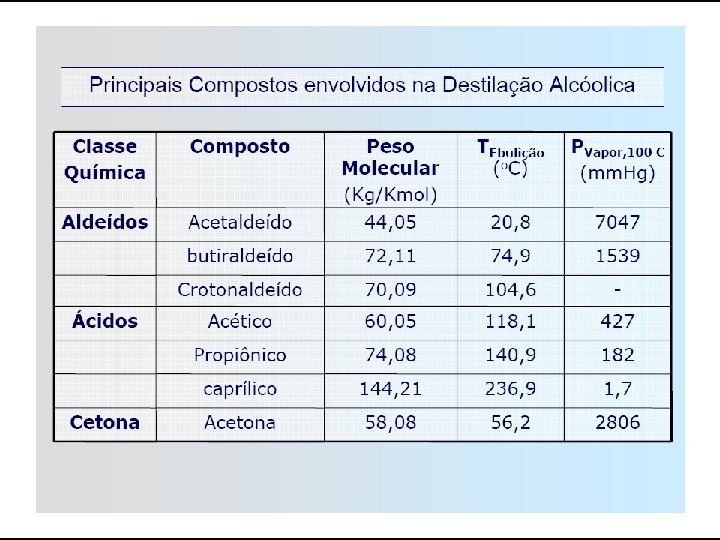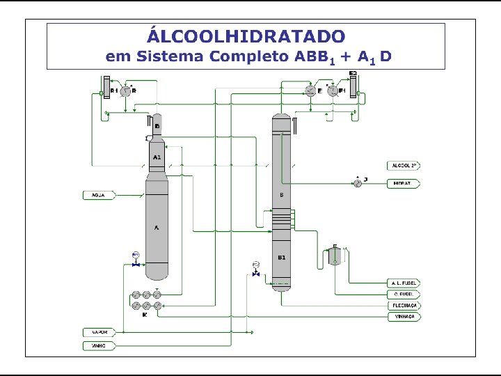 CONSIDERAÇÕES FINAIS ü A destilação e a retificação do vinho são realizadas para se atingir o teor alcoólico exigido por lei para o álcool hidratado ou anidro; ü A destilação do vinho resulta no flegma (sol. Hidroalcoólica de 45 a 50 o. GL) e na vinhaça; ü A retificação é realizada para retirar as impurezas do álcool (álcoois superiores, ésteres, ácidos e outros); os produtos da retificação são: álcool hidratado, óleo fúsel e flegmaça;