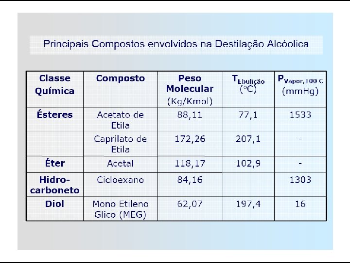 DESIDRATAÇÃO DE ÁLCOOL Ciclo-hexano PROPRIEDADES FÍSICAS DO CICLO-HEXANO • Ponto de ebulição 80, 7ºC • Densidade a 20/4ºC 0, 7786 • Densidade do vapor em relação ao ar 2, 9 • Ponto de fulgor (Vaso fechado) -18ºC • Temperatura de ignição 260ºC • Limite de explosividade 1, 3 a 8, 4 %vol. • Insolúvel na água • Miscível em álcoois, éter etílico e hidrocarbonetos