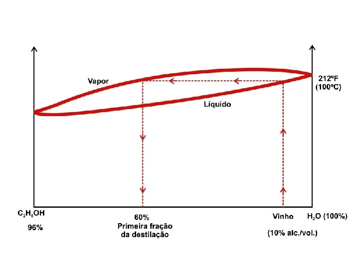 Destilação Se fervemos uma solução alcoólica [por exemplo, vinho], os vapores liberados terão um teor alcoólico maior do que o vinho. Exemplo: Se fervemos um liquido com 8% de álcool, os vapores terão em torno de 50% de álcool. Se agora condensamos estes vapores teremos um liquido com 50% de álcool. 50 % 96 %
