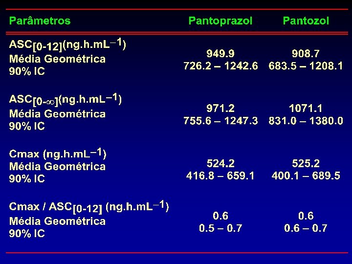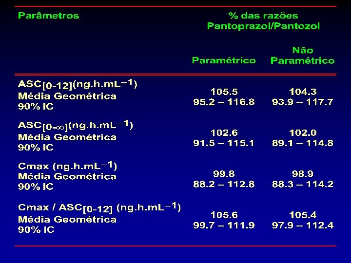 Parâmetros para determinar a Bioequivalência • ASC (0 -t) = Área sob a curva de concentração sangüínea vs tempo • Cmax = Pico de concentração plasmática do fármaco • t(max) = Tempo para atingir o pico da concentração máxima