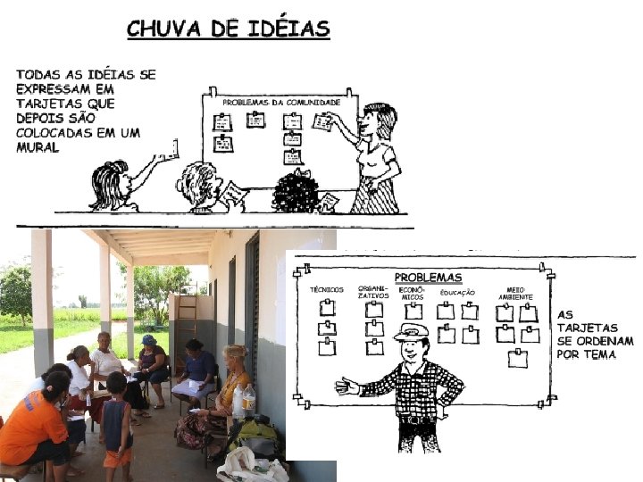Metodologia Chuva de idéias É utilizada para obter informação pertinente, de forma rápida, trabalhando em reuniões com um grupo reduzido buscando a percepção das pessoas. Encontro com o grupo de mulheres da Gleba XV. O tema abordado foi o do desenvolvimento sustentável e o objetivo foi o de aproveitar uma reunião e conhecer a percepção deste grupo sobre o tema. Através do grupo de mulheres pode ser possível saber um pouco mais sobre o que pode vir a ser a opinião das outras pessoas do local. Algumas das mulheres deste grupo poderiam pertencer ao grupo da microdestilaria.