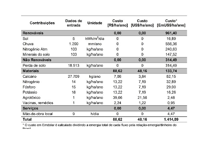 Resultados EYR =Y/F Mede o quanto um investimento permite a um processo exportar recursos locais; Quanto maior o EYR, maior a emergia possível de se retirar por emergia investida (adicionada) ao sistema. A comparação entre o EYR dos três cenários aponta o cenário atual como o de maior razão de rendimento emergético. Os sistemas agrícolas analisados por Odum (1996) apresentaram EYR menores que dois e os valores calculados neste trabalho estão acima desse valor. A contabilização dos fluxos de nitrogênio fixado da atmosfera e dos minerais do solo contribuiu para este fato.