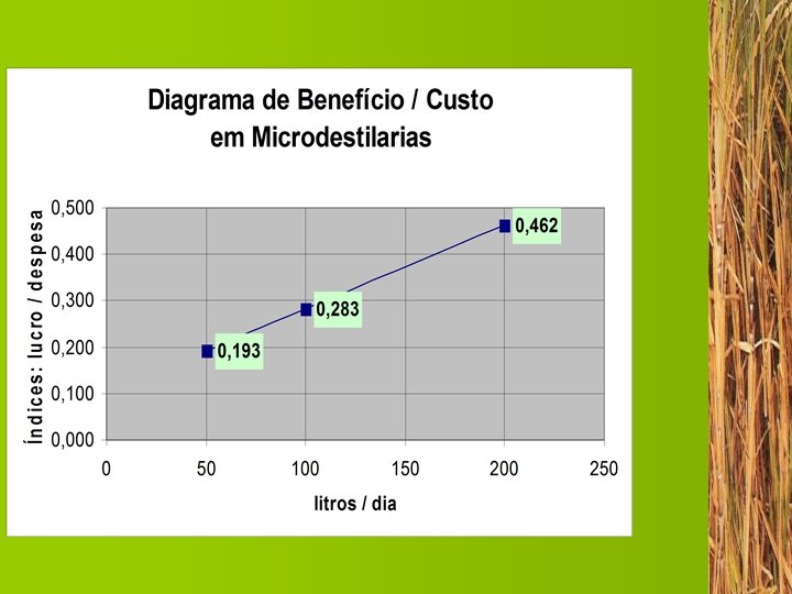 Vantagens atuais Ø Álcool etílico para combustível hidratado (94%) Ø Cinzas do bagaço (adubo potássico - fosfatado) Ø Vinhoto para alimentação do gado e refertilização Ø Esterco fermentado Ø Rapadura Vantagens futuras Ø Bagaço para alimentação de caldeiras Ø Aguardente Ø Vinhoto para fertilização da plantação Ø Bagaço para papel-cartão Ø Açúcar mascavo