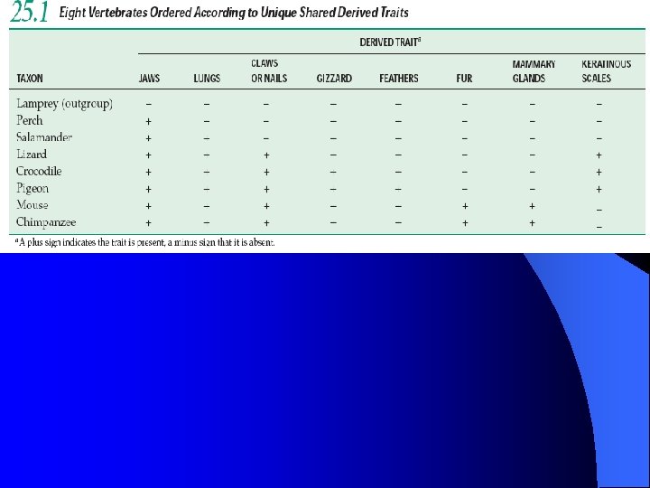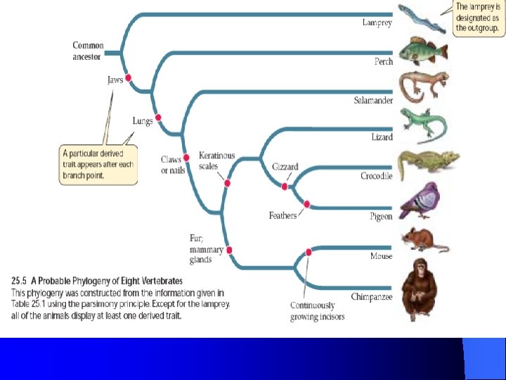 • 3. Construindo filogenias. • A tabela e a árvore filogenética a seguir, mostram etapas e resultados na filogenia de 8 grupos de vertebrados: lampréia (outgroup), percas, pombas, chimpanzés, salamandras, lagartos, camundongos e crocodilos. Foi assumido que qualquer caractere derivado evoluiu apenas uma vez na filogenia dos grupos e que não foram perdidos nos descendentes. • Neste caso, caracteres derivados apareceram sempre depois que o outgroup separou-se do ramo restante. •