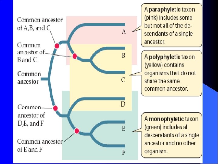 • 5. Classificação biológica e as relações evolutivas. • • Idealmente os grupos ou taxa devem ser monofiléticos. Na cladística formam um clado. Um grupo assim contém todos os descendentes de um ancestral. • • Caso um grupo contenha alguns descendentes de um ancestral e outros que não são é dito polifilético. • Um grupo parafilético contém um, ou mais ramos descendente do ancestral, mas não outros. • A classificação atual mantém muitos grupos polifiléticos por falta de consenso de como classificá-los.