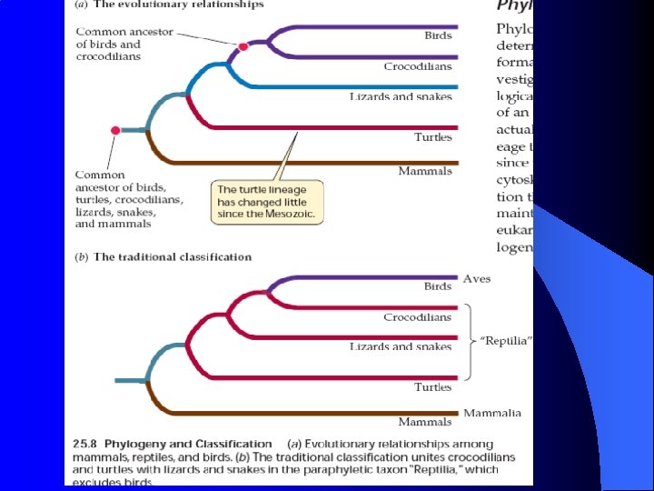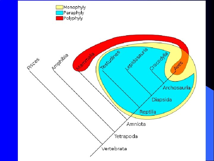 • 5. Classificação biológica e as relações evolutivas. • Em alguns casos a classificação parafilética permanece por um entendimento de que um dos grupo derivados adquiriu caracteres derivados muito distintivos e mais rapidamente do que o grupoirmão. É o caso das aves e crocodilos, que formariam um taxon monofilético, mas são mantidos em classifações separadas. • É usado o nome grado para este tipo de grupo.