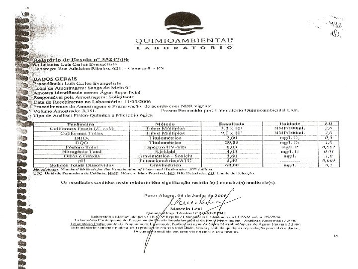 • 1. Parâmetros físico-químicos usuais na qualidade da água. • Observar e discutir as seguintes análises de água corrente e superficial, com laudo de contaminação e poluição. • Discutir os resultados, a partir da Resolução 357/05 do CONAMA (complementar com a leitura da resolução).