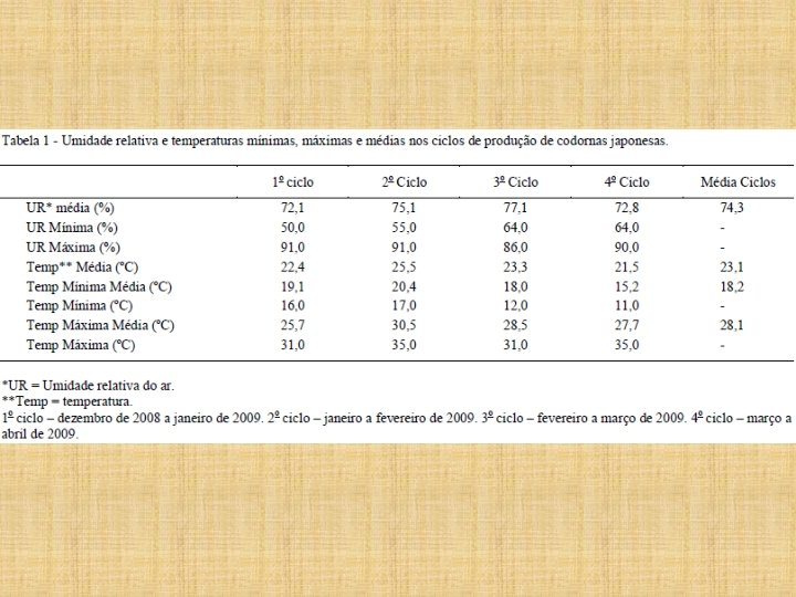 Introdução As codornas japonesas (Coturnix coturnix japonica) são aves de pequeno porte, com peso adulto entre 120 e 180 g. A incubação dos ovos dura 16 dias. As aves nascem pesando 10 g. Os neonatos crescem muito rápido, duplicando o seu peso corporal aos cinco dias de idade. A maturidade sexual é alcançada aos 42 dias nas fêmeas e aos 48 dias nos machos. O período de postura dura 10 meses e cada ovo pesa cerca de 12 g. As aves atingem o peso de abate aos 45 dias de idade. A codorna é uma ave rústica que se adapta a regiões de climas frios e quentes. No entanto, a faixa ideal de temperatura para proporcionar conforto ambiental às aves varia entre 21 e 25ºC. Além disso, precisam de muito pouco espaço: na área ocupada por uma só galinha podem ser criadas 42 codornas. Supondo-se que esse plantel seja composto de 21 fêmeas e 21 machos, ele produzirá, diariamente, 21 ovos com 10 a 12 gramas cada um, o que equivale a 5 ovos de galinhas. O preço de comercialização dos ovos e da carne oscila muito em função dos custos da ração e dos produtos veterinários, mas, em qualquer situação, é sempre melhor que o do frango.