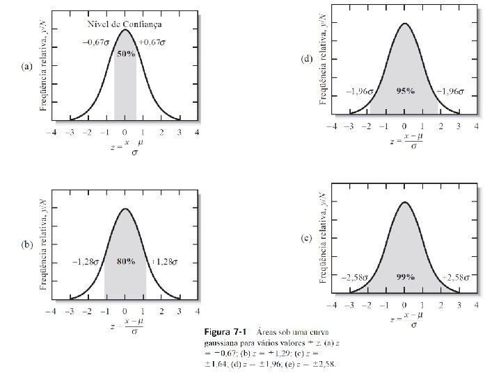 Propriedades da curva normal • Considerando a distribuição normal, o desvio padrão ( ), os valores de z (desvio da média (x - µ) relativo ao desvio padrão ( )), pode-se concluir: • A população ( ) ocorre no ponto central da frequência máxima • Existe uma distribuição simétrica dos desvios ( ) negativos e positivos em torno do máximo (µ) • Existe um aumento exponencial no número de repetições (frequência) à medida que a magnitude do desvio ( ) diminui