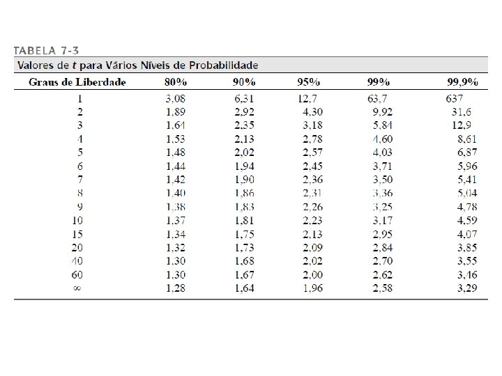 Intervalo de Confiança da Média quando é ? • Sabe-se que para N grande X (média) e s (desvio padrão), são estimativas de e (desvio padrão da população) • Em química analítica pequeno número de determinações • Na prática apenas as estimativas podem ser calculadas • Porém, s: somente para um grande número de medidas, o que não ocorre na prática. • Assim, o intervalo de confiança deve ser maior para s (poucos medidas) tender a . • Valor t Desvio da média em relação a s