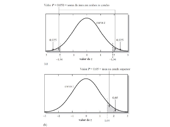 Testes de hipóteses (significância) • Hipótese nula (H 0) cita que duas ou mais quantidades observadas são estatisticamente iguais, ou seja: = 0 • NC (Em termos fracionários) (valor p) • NC (Em termos percentuais) (1 - ) X 100 • Teste z para grandes amostras: