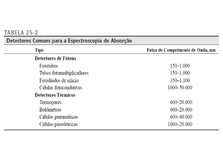 Detectores • Dispositivo que indica existência de fenômeno físico • Produz um sinal elétrico quando é golpeado por um fóton; • Depende do comprimento de onda dos fótons incidentes; • Transdutor: detector que converte luz, p. H, massa e temperatura em sinais elétricos que podem ser amplificados, manipulados e convertidos em números;