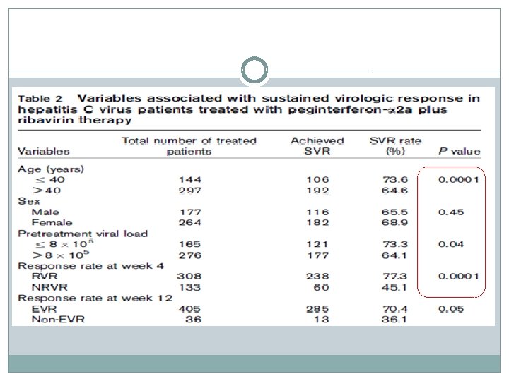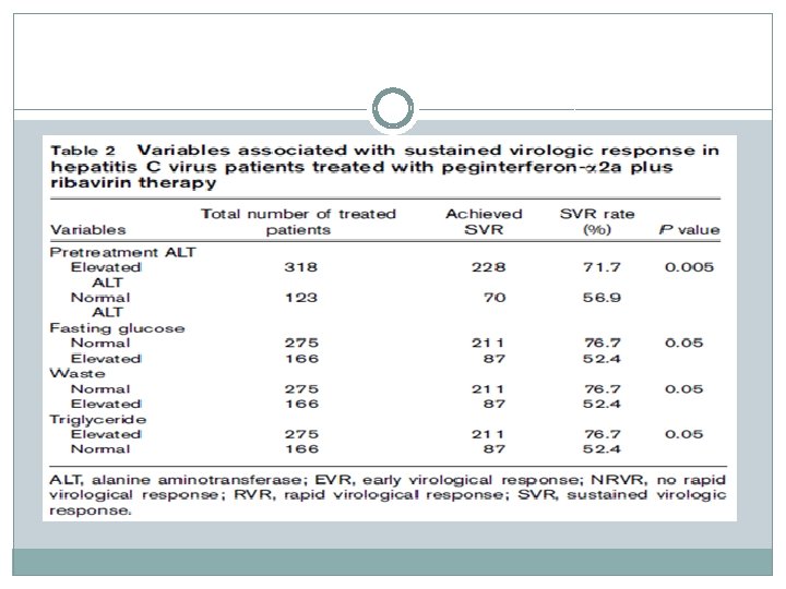 REGRESSÃO LOGÍSTICA Regressão Logística multivariada mostrou que as varíaveis : � glicemia normal de jejum; P <0, 001); �RVR (P <0, 0001); � baixa carga viral (P <0, 001); �síndrome metabólica (P <0, 001) Tiveram influência positiva na SVR.