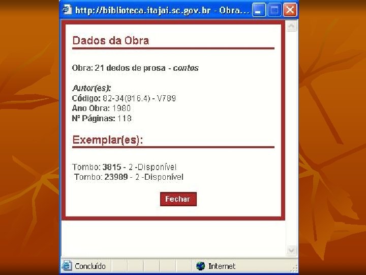Acesso via internet n n Acervo e reserva estão disponíveis pela Internet Os usuários cadastrados na Biblioteca podem consultar o acervo, renovar seu empréstimo e reservar obras pelo site da Biblioteca www. biblioteca. itajai. sc. gov. br