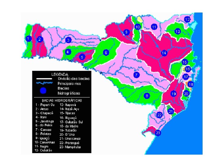ECOLOGIA DE RIOS Definições Bacia Hidrográfica – É uma área da superfície terrestre que drena água, sedimentos e materiais dissolvidos para uma saída comum, num determinado ponto de um canal fluvial. O limite de uma bacia hidrográfica é conhecido como divisor de drenagem ou divisor de águas. Sub-bacia Microbacia Rio - Classificação ou ordem de Rios