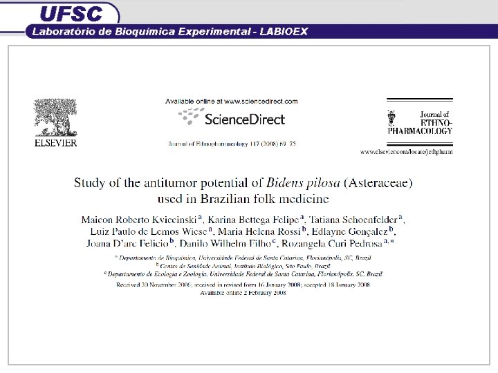 Bidens pilosa Linné ü Picão-Preto ü Uso Popular: verminoses, cirrose hepática (malária), feridas, intoxicação, tumores ü Propriedades farmacológicas comprovadas: Antiinflamatória Antimalárica Antibacteriana Antitumoral Hepatoprotetora RABE, 1997 Citotóxica Antihipertensiva () (ALVAREZ et al. , 1996; RABE, 1997; BRANDÃO et al. , 1997)