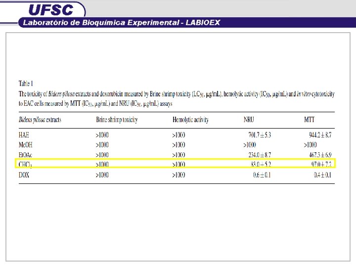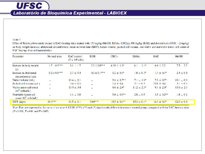 (** e ***) representam diferença estatística significativa (p < 0, 01 e p < 0, 001) respectivamente, em relação ao controle negativo Linhagem tumoral CI 50 (µg/m. L) Ehrlich 169 ± 1, 8 MCF-7 187 ± 2, 2
