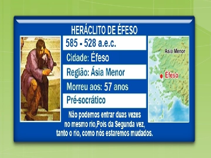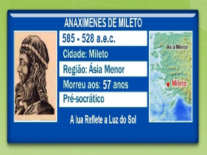 OS QUATRO GRANDES PERÍODOS DA FILOSOFIA GREGA ESCOLA JÔNICA: Tales de Mileto, Anaxímenes de Mileto, Anaximandro de Mileto e Heráclito de Éfeso. ESCOLA ITÁLICA: Pitágoras de Samos, Filolau de Crotona e Árquitas de Tarento.