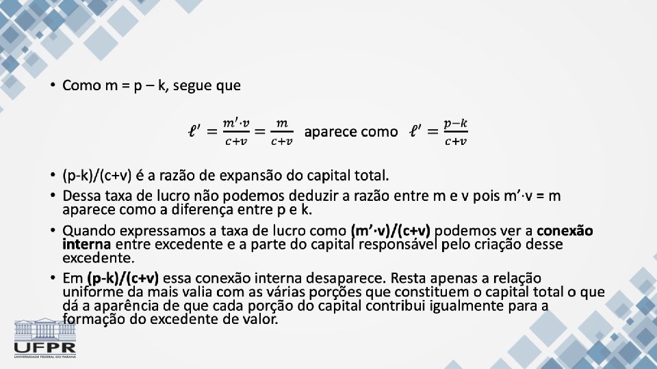 • m/v e m/(c+v) são as taxas de mais valia e de lucro. Essas taxas são de magnitude diferente enquanto a mais valia é igual. • Sob a forma m/(c+v), a mais valia se converte em lucro, forma na qual sua origem e segredo de sua existência são obscurecidos. • Tanto em m/k = margem de lucro sobre o custo • quanto em m/C = taxa de lucro a única diferença que interessa ao capitalista é a diferença entre capital fixo e circulante
