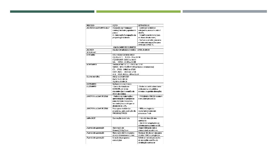ETAPAS DO TRABALHO NA UFRN Apresentação pela PROEX no Fórum de Coordenadores de Graduação e indicação dos membros da Comissão. A comissão se reuniu entre outubro de 2015 e dezembro de 2017, quinzenalmente. Diagnóstico por formulário eletrônico. Reuniões e elaboração da minuta. Discussão e aprovação pela Comissão de Extensão. Apresentação e discussão em outras universidades. Realização de um seminário com participação de pró-reitores da UFMG, UFSCAR e UERN. Agenda de reuniões com todas as unidades acadêmicas, nos locais e na PROEX.