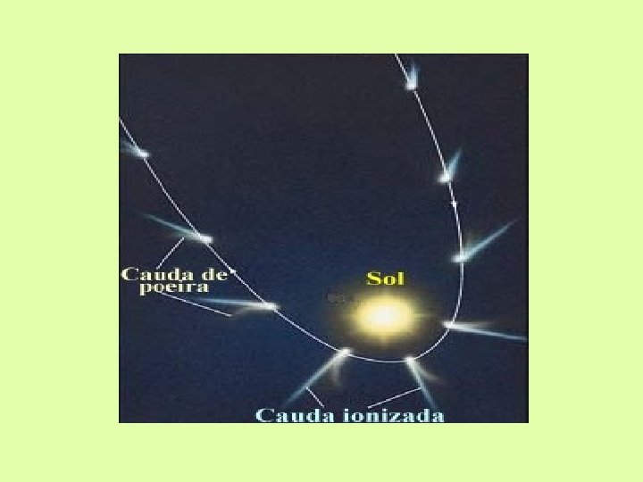 § Cauda de poeira neutra: é curva e amarelada (reflexo da luz solar), é mais larga e segue a órbita kepleriana (mais distante do Sol mais devagar andam as partículas);