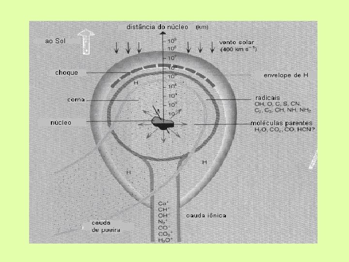 COMA § Tem a forma de uma atmosfera (cujo volume pode ser muito maior que a Terra) sobre o núcleo. § É mais brilhante do que a cauda à qual dá origem. § A presença de componentes à base de hidrogênio, e de oxigênio revela que a constituição do cometa é água.