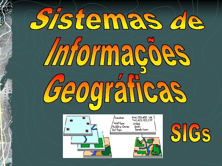 EXEMPLO § Um sociólogo deseja utilizar um SIG para entender e quantificar o fenômeno da exclusão social numa grande cidade brasileira; § Um ecólogo usa o SIG com o objetivo de compreender os remanescentes florestais da Mata Atlântica, através do conceito de fragmento típico de Ecologia da Paisagem; § Um geólogo pretende usar um SIG para determinar a distribuição de um mineral numa área de prospecção, a partir de um conjunto de amostras de campo.