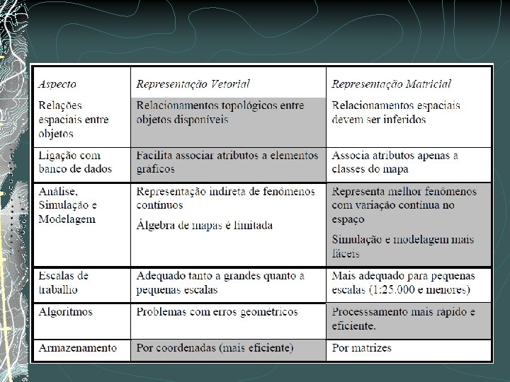 Vetorial x Matricial São mais eficientes no armazenamento de dados de mapas porque eles armazenam somente os contornos das características; • Questão estetica, as saídas são mais apresentáveis do que no formato matricial. •