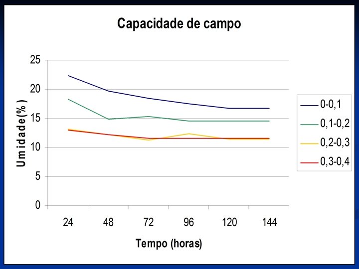 Caracterização físico-hídricas do solo O solo apresenta uma densidade média do solo igual a 1, 6 g cm-3 e uma porosidade média de 40, 0 %, e capacidade de campo de 16, 8, 14, 6, 11, 4 e 11. 6 % para as profundidade de 0 -10, 10 -20, 20 -30 e 30 - 40 cm respectivamente.